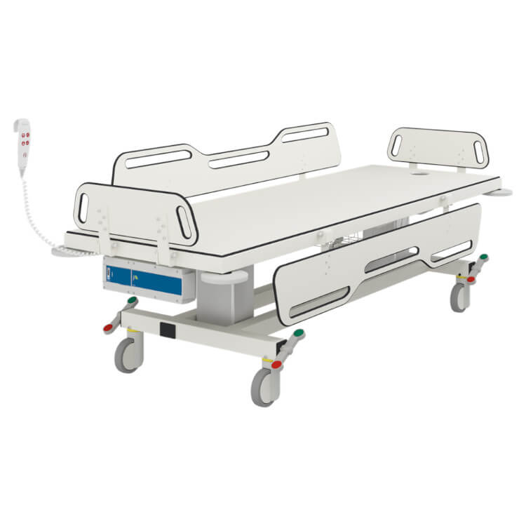 The MSCT 1 change trolley has two fold-down sides, electrically height adjustable (battery operated) with wired remote control and a 400 mm lifting range, from 550 to 950 mm. Can tilt 3 degrees (for easy water drainage).