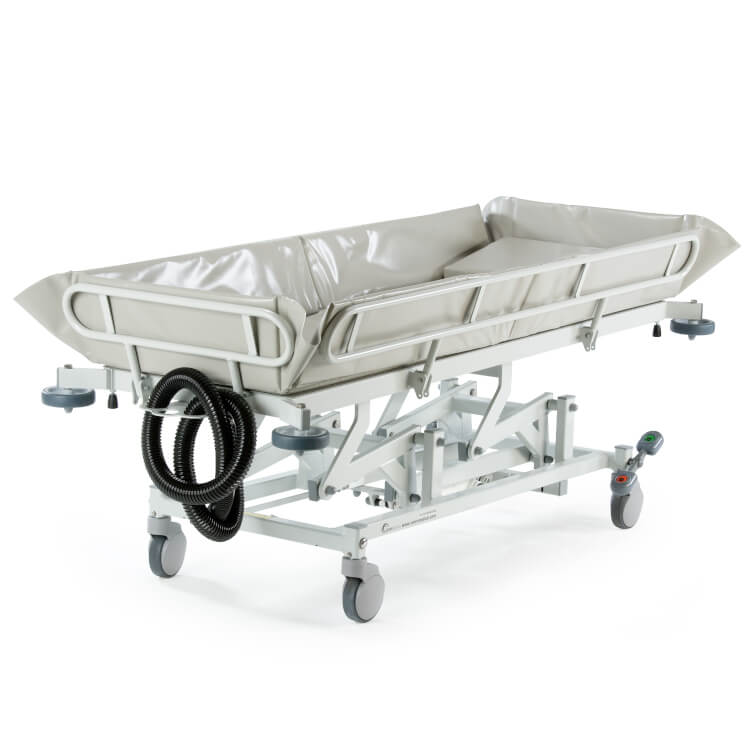 A mobile adult shower trolley available in hydraulic or electric (battery operated) models.