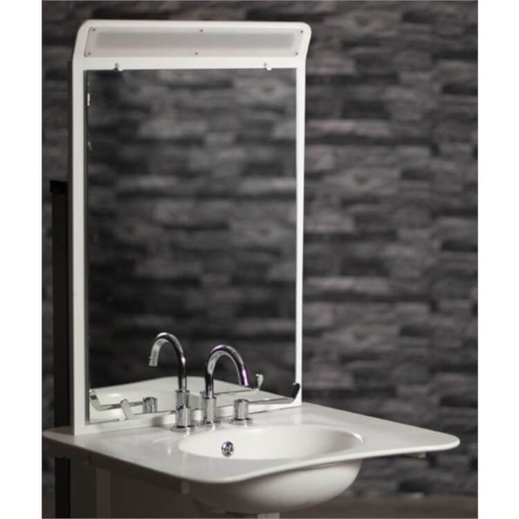 With large basin surround and 300kg maximum load, the ABW wash basins can also assist wheelchair users to move from sitting to standing. The ABW6 450mm high low range is operated by a simple handset control and the large lever taps, or infra-red touch free taps allow for unassisted use for those with limited arm movement. The large integrated mirror, light and a shaver/electric toothbrush socket adjust in height with the basin. The upgraded model (ABW6SP) allows the user to control the water and pop-up waste and an LED strip light above the mirror from the handset.